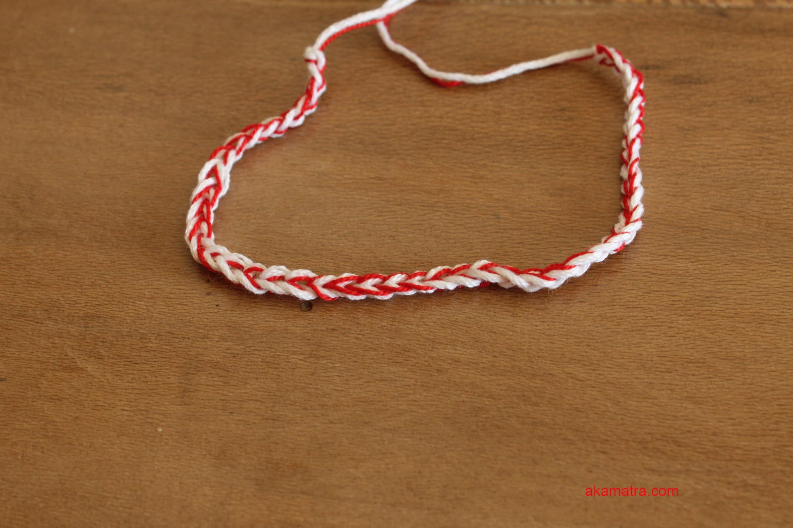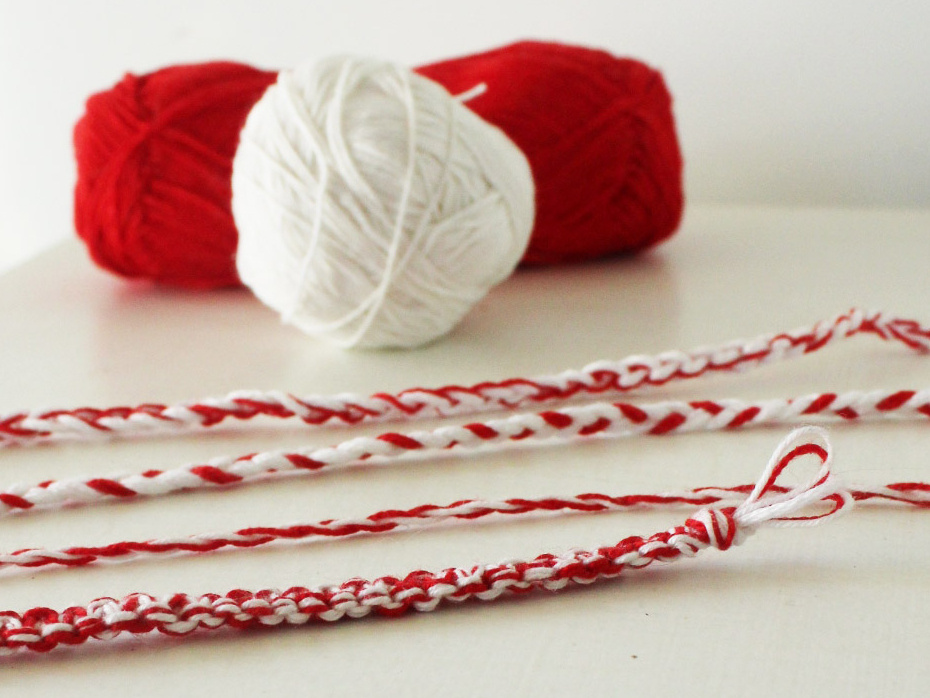 All you need to do is use one strand of red and one strand of white yarn and crochet some chain stitches!