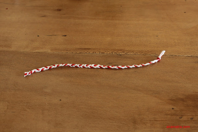 This version is super simple and cute! Just make a three strand braid with your thread! I used two strands of white cotton yarn (2 pieces each) and one strand of red thread (5 pieces of thread).