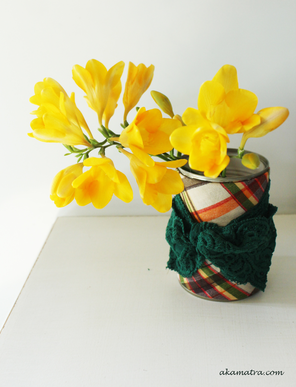 Well in my case, almost done. First I filled it only with my freesias but there was something missing. So I used my green leafs and some cape marguerite to add a splash of color. Much better don't you think?