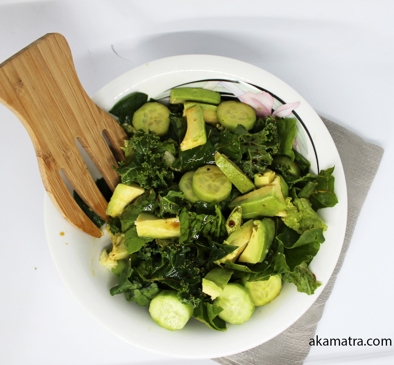Use your hands to cut the leaves in large chunks. Slice the cucumber and avocado and toss them in.