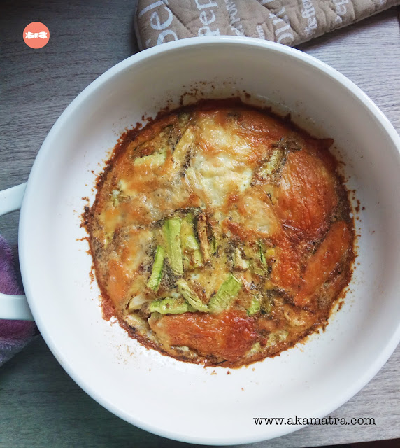 Apart from it being healthier than its fried version I find it is also easier to make. In the fried version you had to fry the zucchini and the potatoes first and then add the beaten eggs and do other fun things like flip the omelet over without burning yourself and making a mess.