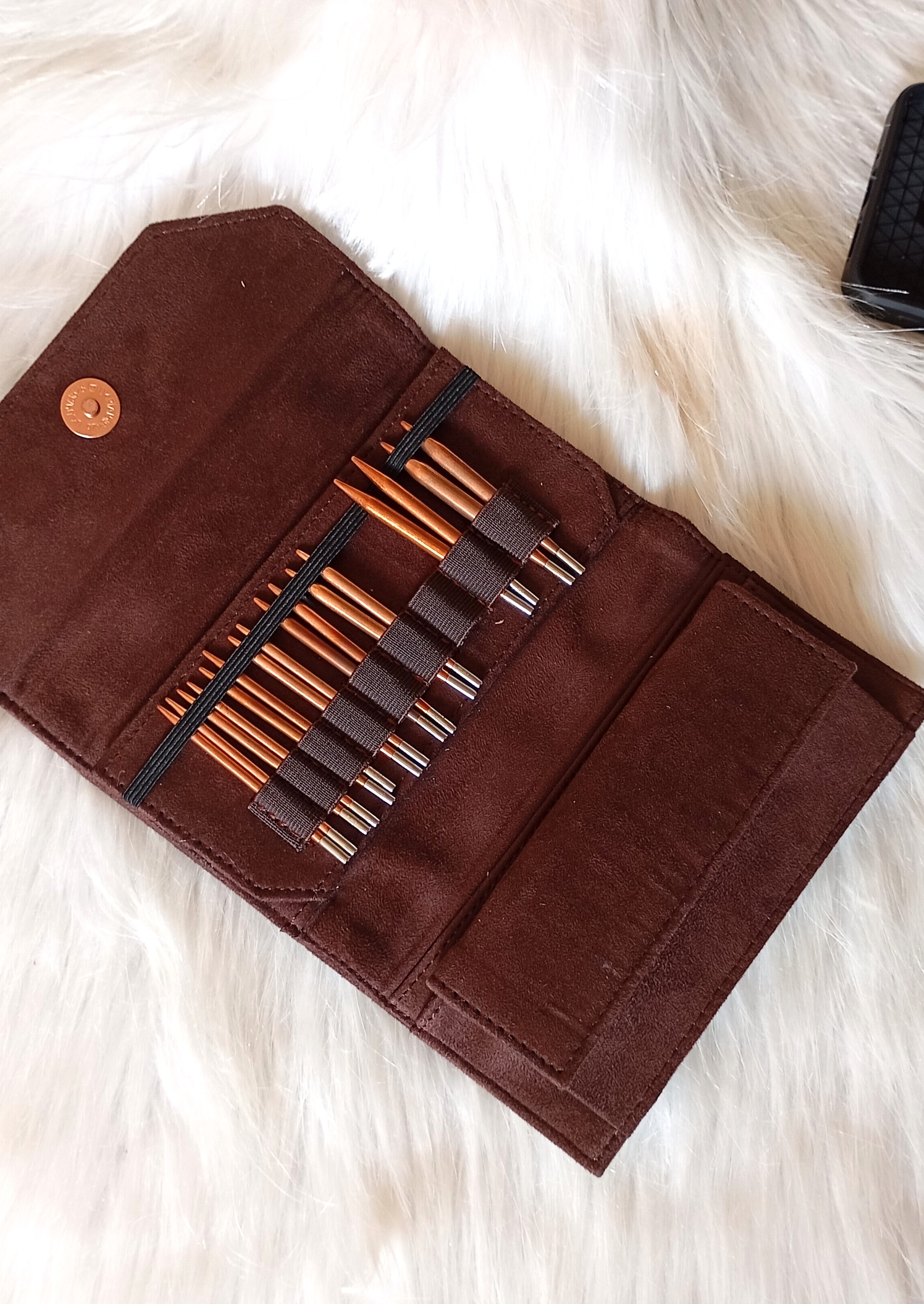 Lykke offers the Cypra needles in interchangeable sets with a variety of tip sizes (from 3.25mm up to 8.00mm) and cord lengths, all neatly organized in a vegan suede case that’s as stylish as it is practical. Plus, these sets are compatible with other major brands, so you can mix and match to your heart’s content.