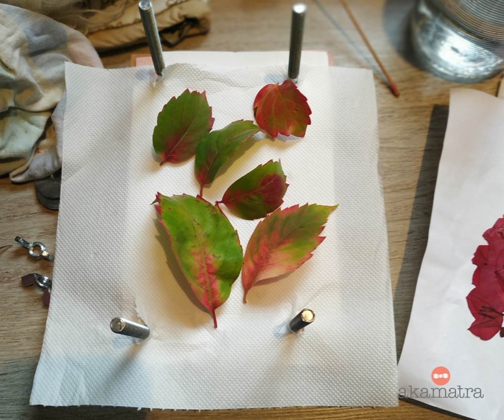 Τοποθετήστε τα άνθη και τα φύλλα βάζοντας μεταξύ τους απορροφητικό χαρτί κουζίνας και αφήστε τα να ξεραθούν για μία βδομάδα. Φροντίστε να τα ακουμπήσετε με τρόπο ώστε να μην τσακίζονται.